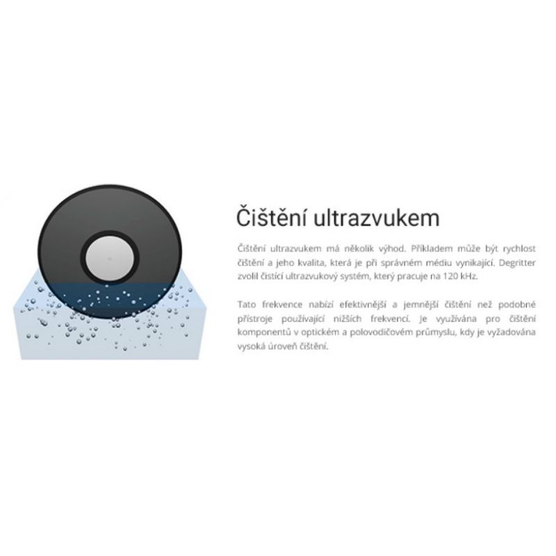 Proces praní probíhá na vysoké frekvenci ultrazvukového kmitočtu 120 000 Hz v destilované vodě s příměsí nepatrného množství cca 1,5ml příměsi originálního roztoku Degritter.