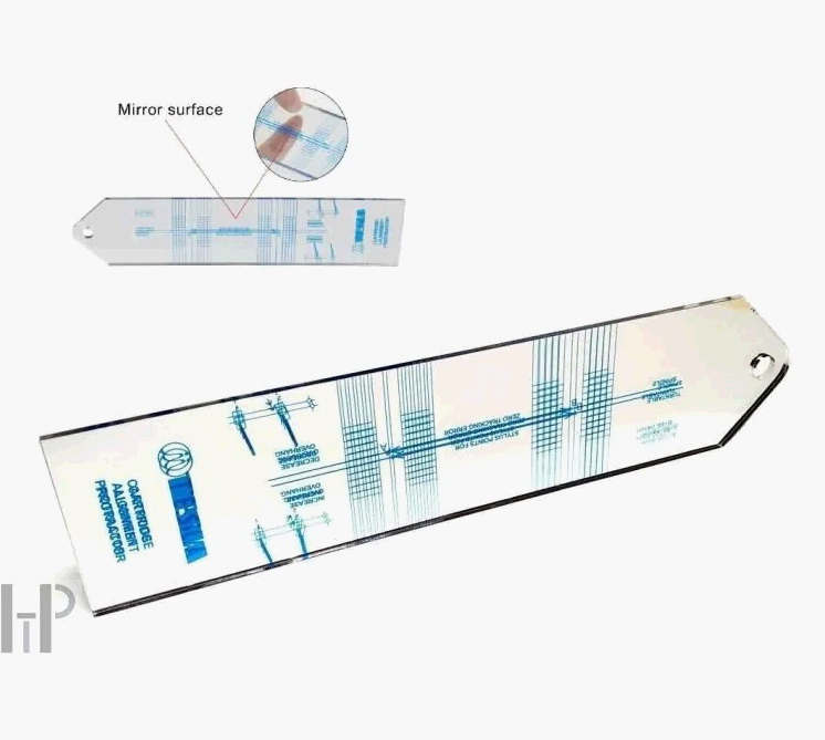Šablona je vybavena zrcátkem pro kontrolu kolmosti hrotu přenosky.