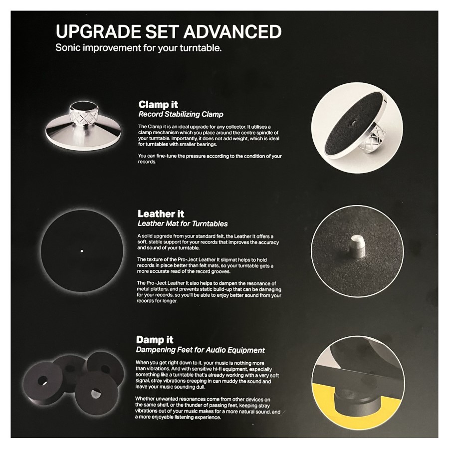 Chcete-li upgradovat zvukové kvality svého gramofonu Pro-Ject, stává se pro vás tato sada příslušenství nepostradatelnou. Obsah sady je univerzální pro všechny modely gramofonů Pro-Ject i většinu gramofonů jiných značek. Použití příslušenství nevyžaduje speciální znalosti ani nastavení, je uživatelsky jednoduché a zvukový přínos je slyšitelný a okamžitý.