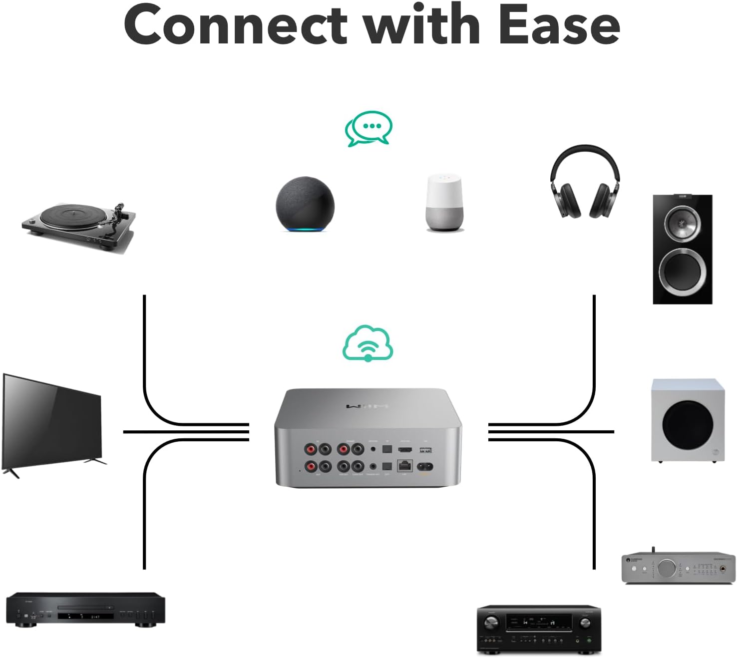 WiiM Ultra disponuje gramofonovým předzesilovačem, tím lze jednoduše připojit gramofon osazený MM/MC přenoskou. Předzesilovač Ultra pomůže nastavit akustickou korekci místnosti pomocí iOS telefonů a tím vylepšit výkon připojených reproduktorů a subwooferu. Subwooferový výstup umožní připojení subwooferu v kombinaci s integrovaným nebo koncovým zesilovačem bez subwoferového výstupu. Navíc díky vestavěnému EQ si lze upravit nízké frekvence dle vašich preferencí. Osazení HDMI ARC vstup umožňuje pohodlně připojit chytrou TV pro co nejjednodušší ovládání hlasitosti. Skrze HDMI lze do předzesilovače posílat Dolby Digital zvuk, díky kvalitnímu integrovanému D/A převodníku dosáhnete skvělého zvuku z TV.