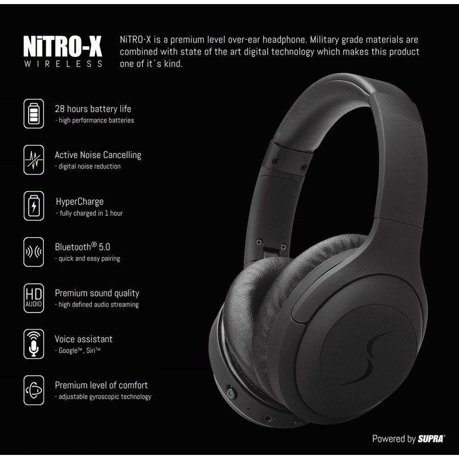 NiTRO-X je navržen tak, aby poskytoval optimální pohodlí i při dlouhodobém používání. Náušníky pro sluchátka jsou vyrobeny z materiálu membránového typu, SUPRA BreathTex ©. Materiál umožňuje, aby teplo a vlhkost procházely náhlavní soupravou a zároveň chránily před přicházející vlhkostí a rušivým okolním hlukem. SUPRA BreathTex © v kombinaci s držákem na odlehčení tlaku, trvanlivým lehkým materiálem a otočnými kryty umožňuje mnoho hodin poslechu, aniž by se sluchátka cítila teplá nebo nepohodlná.